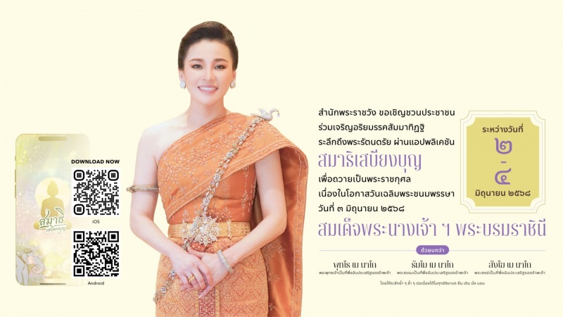 สำนักพระราชวัง ขอเชิญชวนประชาชนร่วมเจริญอริยมรรค "สัมมาทิฏฐิ" ระลึกถึงพระรัตนตรัย ด้วยบทว่า พุทโธ เม นาโถ (พระพุทธเจ้าเป็นที่พึ่งอันประเสริฐของข้าพเจ้า) ธัมโม เม นาโถ (พระธรรมเป็นที่พึ่งอันประเสริฐของข้าพเจ้า) สังโฆ เม นาโถ (พระสงฆ์เป็นที่พึ่งอันประเสริฐของข้าพเจ้า) (โดยให้ระลึกย้ำ ๆ ซ้ำ ๆ ต่อเนื่องได้ในทุกอิริยาบถ ยืน เดิน นั่ง นอน) เพื่อถวายเป็นพระราชกุศล เนื่องในโอกาสวันเฉลิมพระชนมพรรษา สมเด็จพระนางเจ้า ฯ พระบรมราชินี วันที่ ๓ มิถุนายน ๒๕๖๘ ระหว่างวันที่ ๒ มิถุนายน ๒๕๖๘ เวลา ๐๘.๐๐ น. ถึง วันที่ ๔ มิถุนายน ๒๕๖๘ เวลา ๐๘.๐๐ น. ผ่านแอปพลิเคชัน "สมาธิเสบียงบุญ" ทั้งนี้สามารถดาวน์โหลดแอปพลิเคชันได้ทั้ง PLAY STORE และ APP STORE