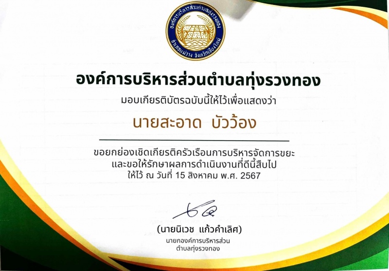องค์การบริหารส่วนตำบลทุ่งรวงทองมีการยกย่องเชิดชูเกียรติครัวเรือนในการบริหารจัดการขยะ