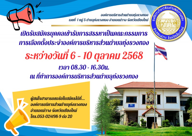 เปิดรับสมัครบุคคลเข้ารับการสรรหาเป็นคณะกรรมการการเลือกตั้งประจำองค์การบริหารส่วนตำบลทุ่งรวงทอง ระหว่างวันที่ 6 - 10 ตุลาคม 2568