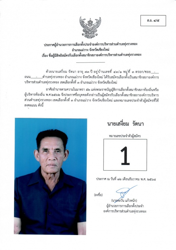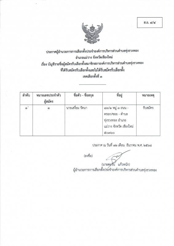 ประกาศรายชื่อผู้มีสิทธิสมัครรับเลือกตั้งสมาชิกสภาองค์การบริหารส่วนตำบลทุ่งรวงทอง เขตเลือกตั้งที่ 3 (ส.ถ.4/4)