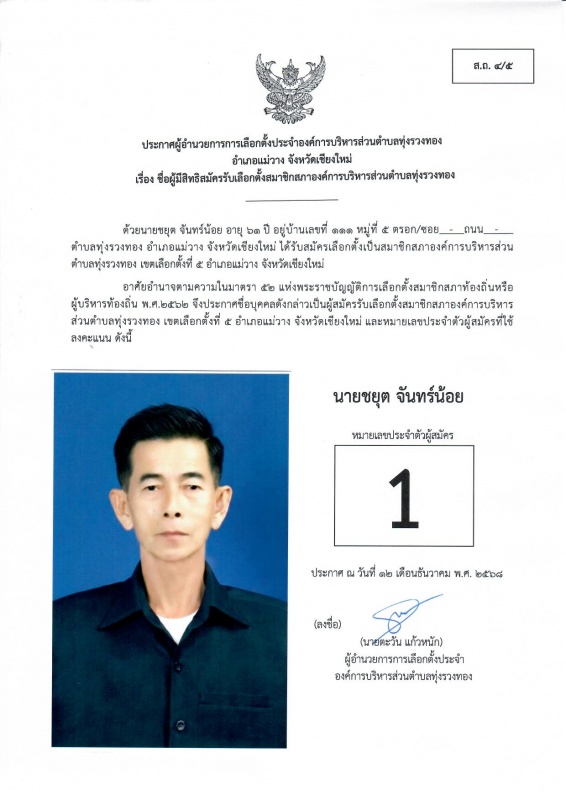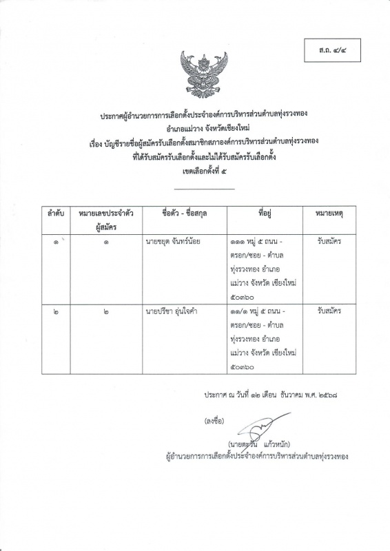 ประกาศรายชื่อผู้มีสิทธิสมัครรับเลือกตั้งสมาชิกสภาองค์การบริหารส่วนตำบลทุ่งรวงทอง เขตเลือกตั้งที่ 5 (ส.ถ.4/4)